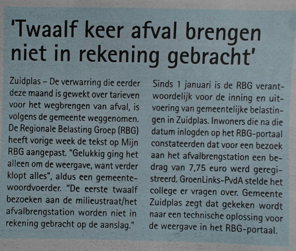 Het hield de gemoederen, ook in Dianthus, bezig de afgelopen dagen. Bij het milieustation werd opeens volgens zeggen bijna een tientje tot 25 euro (bleek in de meeste gevallen om nog geen 8 euro te gaan) extra in rekening gebracht als men grofvuil kwam brengen. Oorzaak: een systeemfoutje in de software waarbij werd vermeld dat dit in rekening zou worden gebracht, maar dat dus niet werd. Voor alle duidelijkheid: